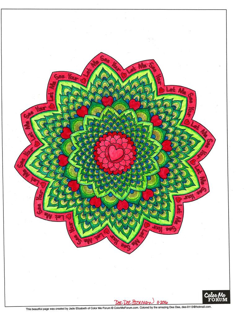 I love this mandala! It has two of my favorite elements - hearts and peacock feathers! It's intricate yet it's fun, and I really enjoyed coloring it.